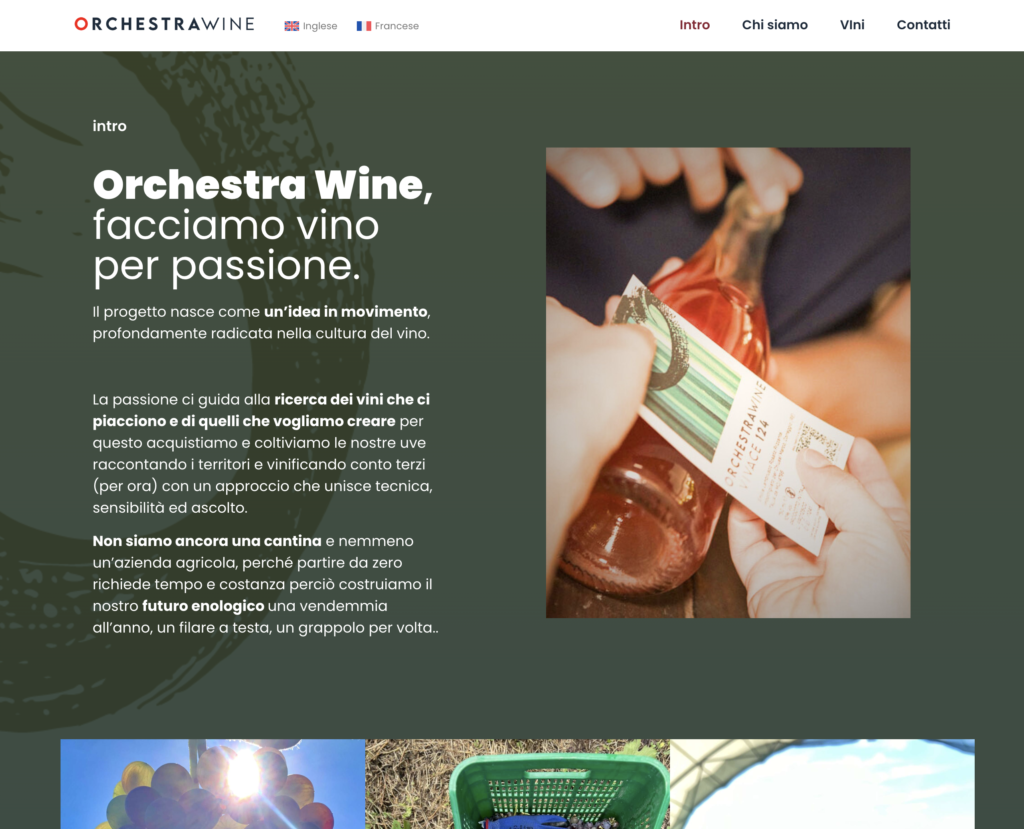 Nel caso di Orchestra Wine questo aspetto era particolarmente importante. È un progetto in evoluzione, destinato a crescere nel tempo con nuove vendemmie e nuovi capitoli del suo percorso. Per questo il sito è stato pensato come una struttura semplice e flessibile, capace di adattarsi alla crescita del progetto mantenendo sempre una narrazione chiara e coerente.